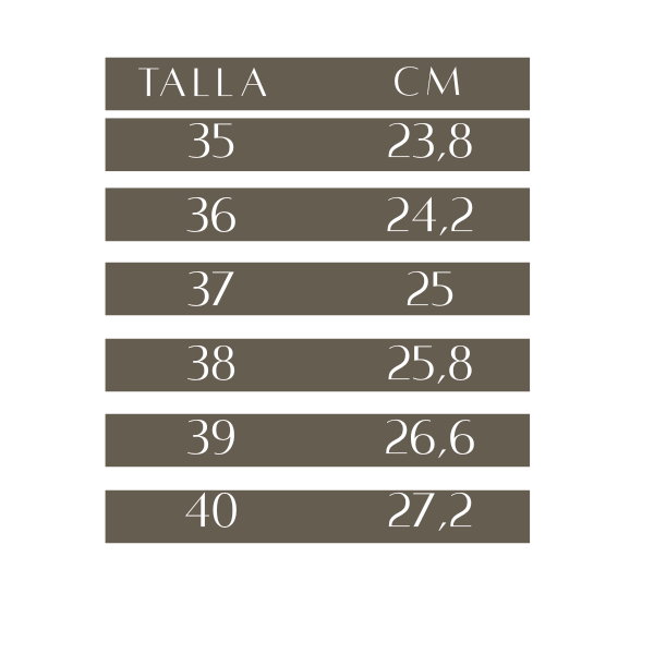 NOTA: Este modelo tiene horma normal y las medidas son solo una referencia del zapato, ya que debes considerar que al ser terminados en punta, tienen a ser más largos en cm.
